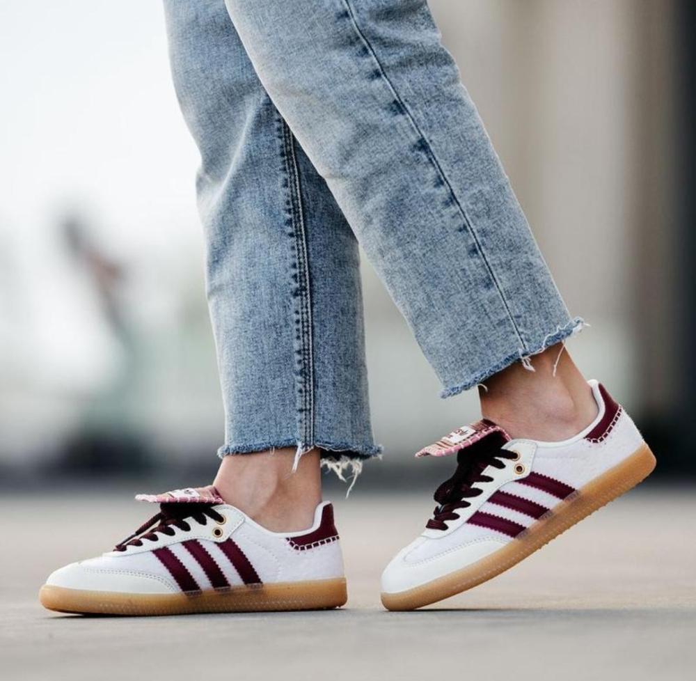 يتمتع حذاء سامبا أوف وايت خمري من أديداس بتصميم كلاسيكي لا يتأثر بمرور الزمن. يتميز بأجزاء علوية من الجلد الأبيض المتين مما يضفي لمسة من اللون على التصميم. كما يتميز بلسان مبطن مما يوفر الراحة والدعم.